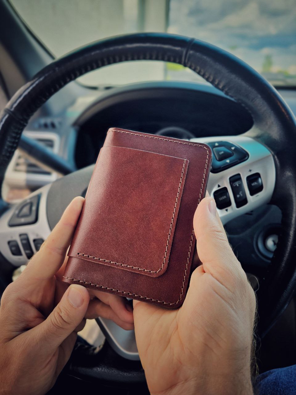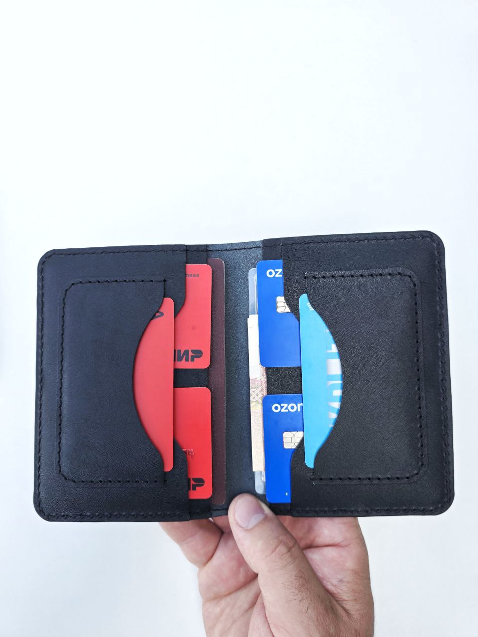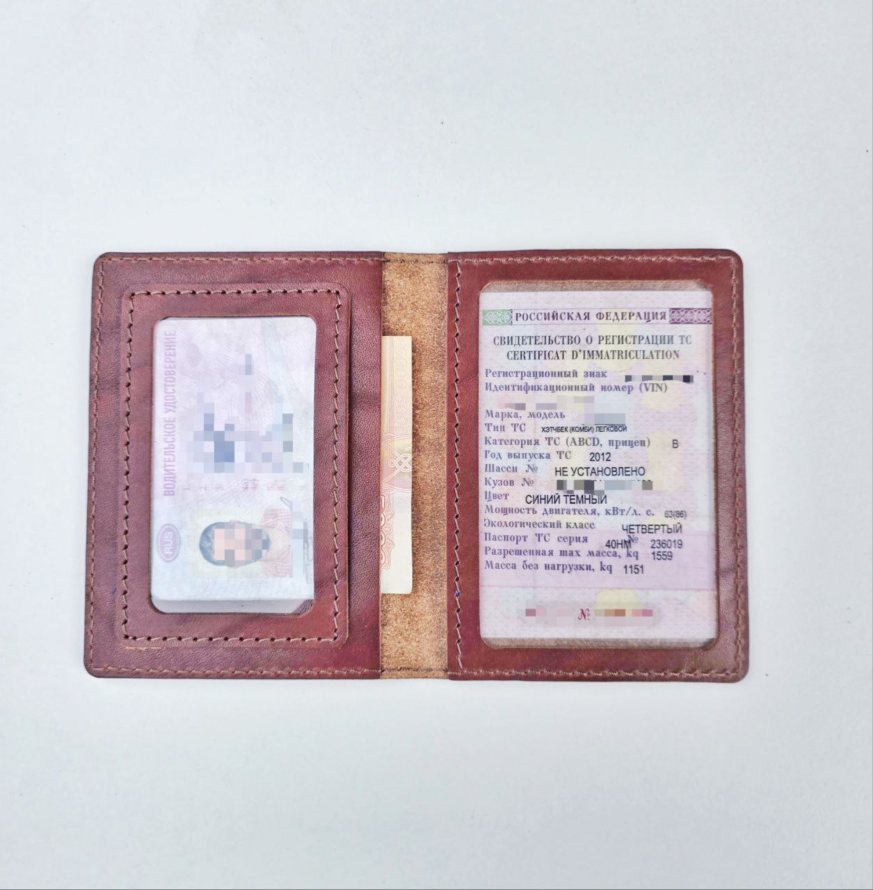 - два отдела для карт (4-8 карт), - Вставка ПВХ для автодокументов - отдел для паспорта - Размер в закрытом состоянии: 11*14 см. - Натуральная кожа, ручная работа, машинный шов. - Изготавливается из кожи 1.3 мм, российского производства.